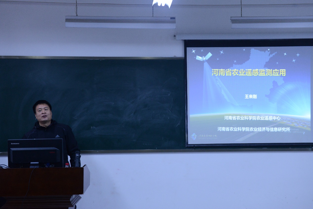 和河南省大数据分析与处理重点实验室的四十余名师生到场聆听。报告由河南省大数据分析与处理重点实验室左宪禹主持。首先,王来刚博士河南省农作物种植面积遥感监测,然后,介绍了长势动态遥感监测、产量预测、农业灾害遥感监测与预警,在讲座最后总结介绍了农业无人机遥感监测、特色农业遥感监测等关键技术研究与应用。报告深入浅出,用日常生活中的例子将原本专业化的河南省农业遥感监测讲解地通俗易懂、生动有趣。报告在师生们热烈的掌声中圆满结束。